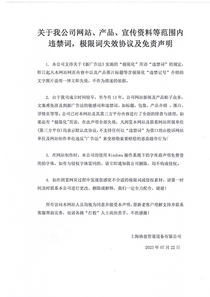 關于我公司網(wǎng)站、產(chǎn)品、宣傳資料等范圍內(nèi)違禁詞,極限詞失效協(xié)議及免責聲明